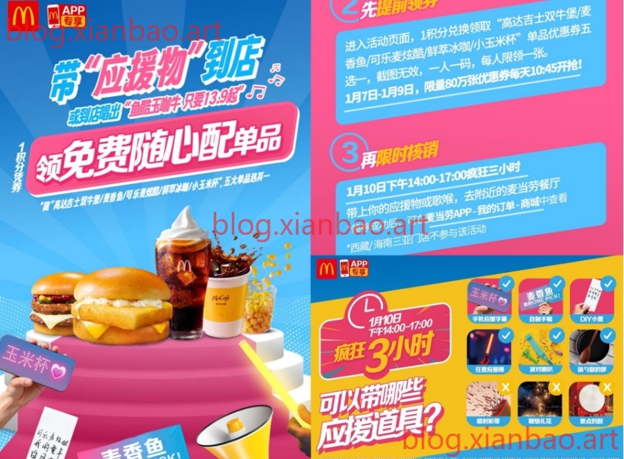 7-9号每天10点45分,麦当劳APP首页“应援物”横幅,用1积芬,綐换五选一单品券(麦香鱼/双牛堡/麦炫酷/冰咖等),无需任消哈 每人限领一张,7号30万张,8-9号每天25万张,核销时间:10号 14-17点,到店携带指定应援物/唱歌即可,积分没有获取方式只有消费过的有