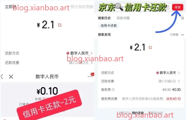 京东搜:信用卡还款,自定义2.1,选中行数币,有显示优惠2.01-2只用支付0.1,如不显示 ,去数字人民币APP,找到中行,绑定一下京东试试。新用户不建议等活动再搞,老用户自行尝试。