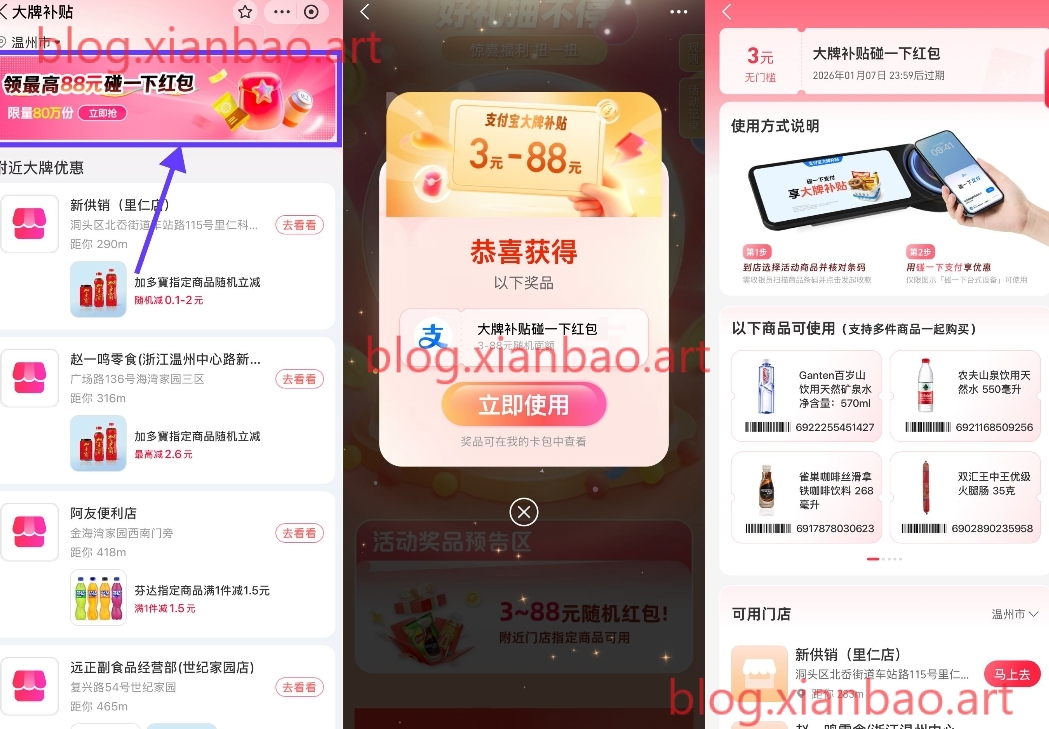 支付宝搜索“大牌补贴”,直接抽3~88亓碰一下荭包,点去使用找附近的店买指定商品即可抵扣