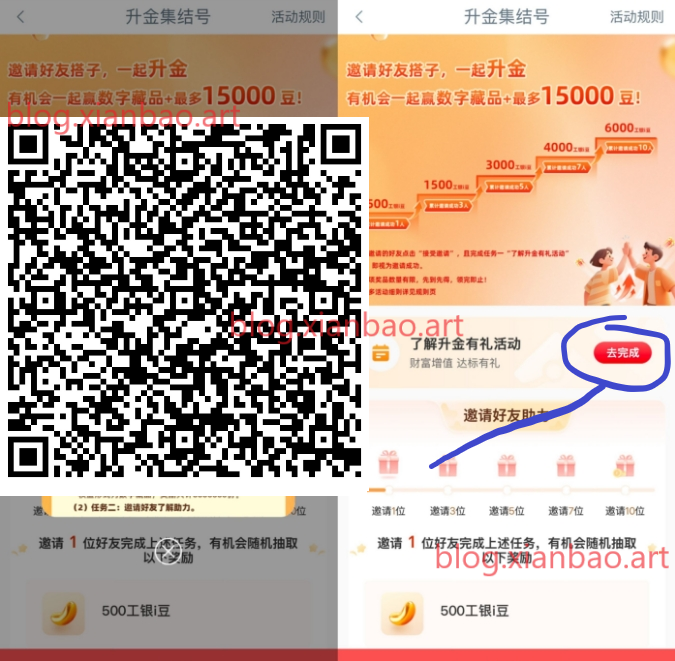 工行app-任务中心-升金集结号或识别直达,阶梯型邀10人助力一下1.5w豆,可以换立减金,我的-工银i豆可以兑东西,或者攒着以后再换微xin识别,1100豆就可以换1立减金:mp://kVwTqfYuaJ4Ekap