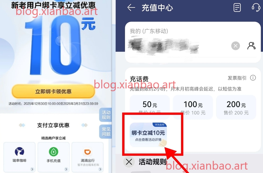 华为负一屏,手机充值,截3.31日,如图绑新咔,有立减10亓,老用户也有,随便新绑一张卡,再去充有50-10立减