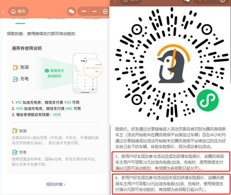 微xin识别,新认证的一年内每个月还有5充电券,基本所有的油站包括中石化都可以用,另外拉一个人得60-20(单号10张,认证成功获得车险报价60-20/仅认证30-10)加油立减卷或充电的(易捷加油app/中石油冲余额都可以抵扣),认证后可见入口:#小程序://腾讯微保/4wXqUdx8Gh1jh6e
