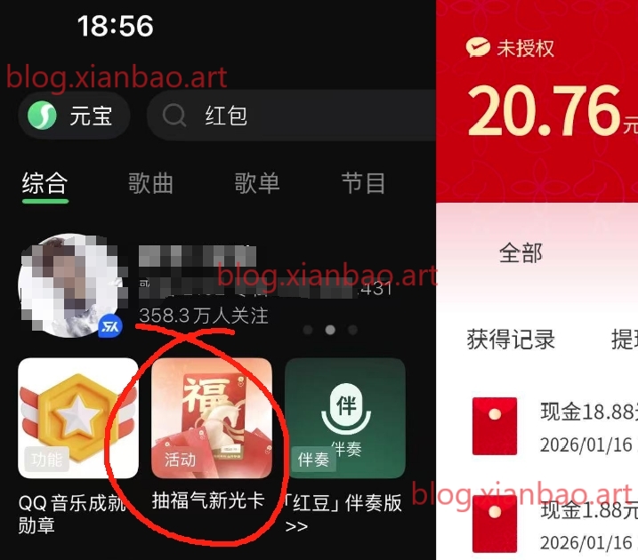qq音乐搜:荭包,如图第二个点进去,建议攒够10次10连抽,有随机零钱或者绿钻体验卡。