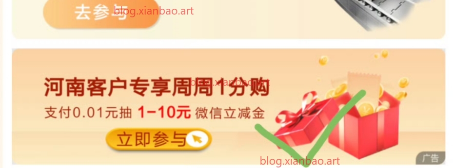 限河南,建行app搜:惠省钱,往下拉找到如图横幅。有0.01抽1-10亓立减金 ,每周一次符合的看看