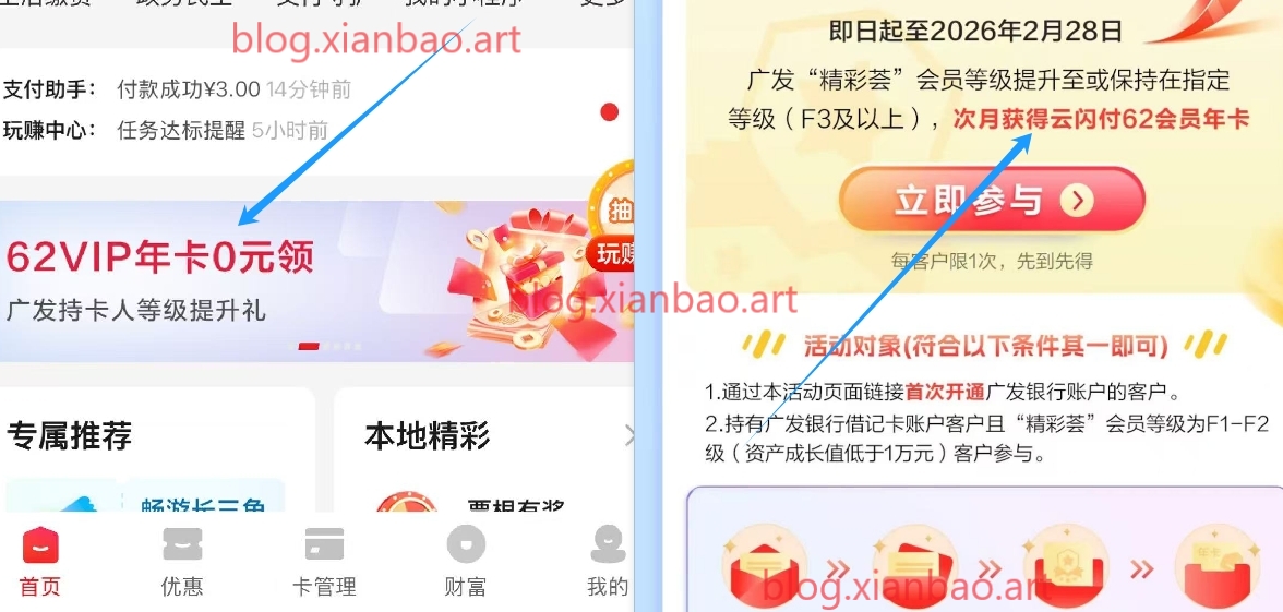 5:芸闪付app首页,部分有这个62vip(每月6券,生活缴费/还xyk可用),这个可以同时和上边达标,如果没有就把广发一类绑芸闪付,等待几天试试,有卡的直接进页面报名就行。