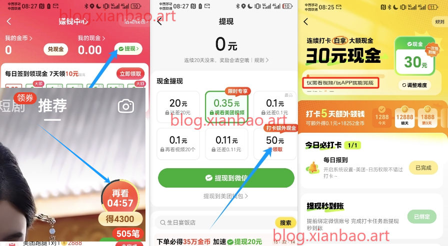 美团app-底部-视频,右边浮窗进,如图点50(没有就点“我的x金” 切换到活动q包),有打咔31天30,66天50,30天20,后期或需观看规定时间视频或下载玩app