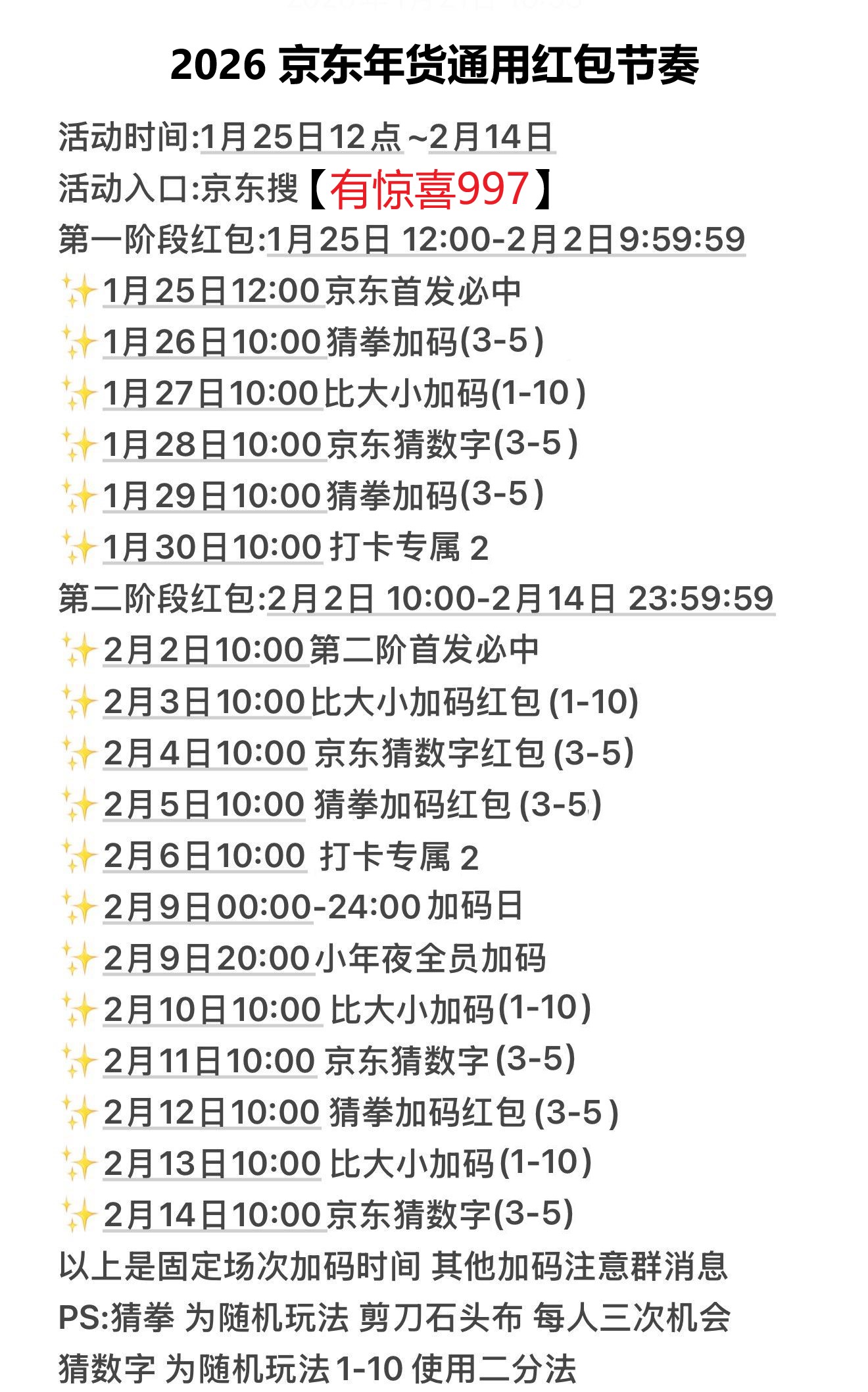 10:00整猜拳领红包~除黑号都有保底!加码前先搜索三次口令“有惊喜997”,先把普通的三次领完10点才能参加加码!京东app搜索“有惊喜997”,反复进去抽3次,三次机会一次胜利就可以抽,卡点有晚点无,没有标准答案,所有号都是随机,三次机会