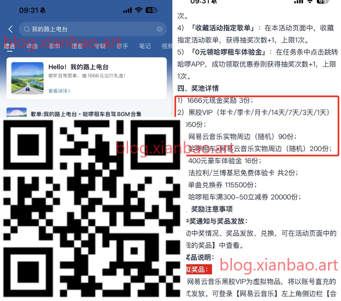 网易云音乐搜:我的路上电台,可做浏览拿次数,抽7w份黑胶荟员,还有少量实物跟1666亓零钱,4.20日截止