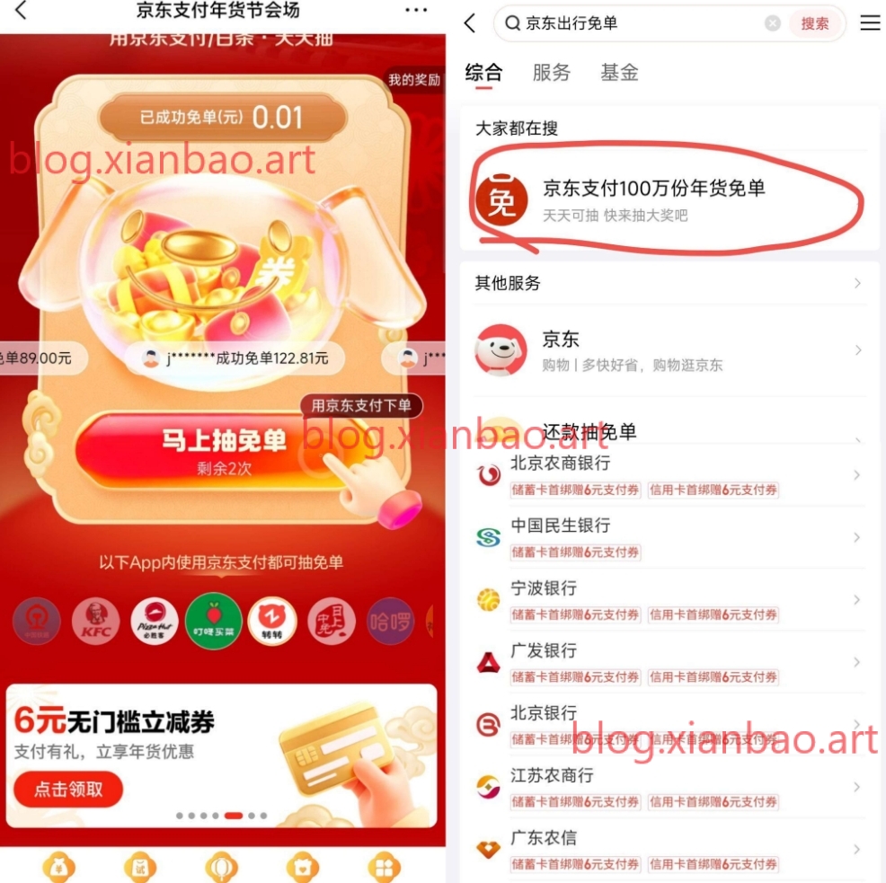 京东金融app搜:京东出行免单,如图找到“6亓无门槛立减”横幅,有绑一张卡,送一张6亓的券,部分号是8亓或15亓,绑完解绑即可,券是通用的,点外卖也行