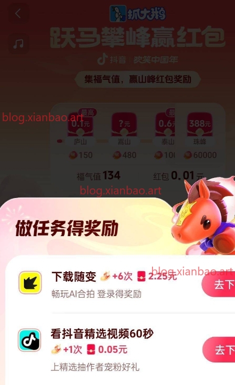 抖音搜:跃马攀峰,目前部分人能进,截3.3日,任务攒福气值,达到不同10个节点,有对应领最高共388,有反馈到达玉龙雪山是145,具体玩法就是狂点+左右手机晃动攒福气值,比较耗时间,建议可用筋膜枪不累手,连点器可能会黑号,视情况玩