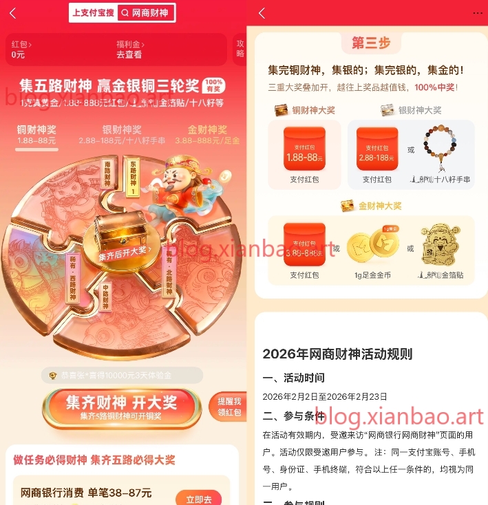 支付宝搜索“网商财神”,集齐五路财神,抽1.88~888亓支付荭包