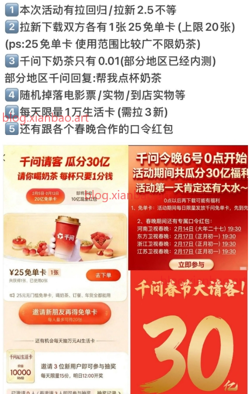 饿了么/淘宝闪购的券,使用范围比较广不限奶茶,提示火爆重启试试或白天重新口令进),老用户对千问发:帮我点杯奶茶,再问我有免单卡吗,大概率一张25,种类多,直接让千问帮你点想要的就可以,奶茶只需0.01,随机掉落电影票/实物/到店实物等新用户下拉