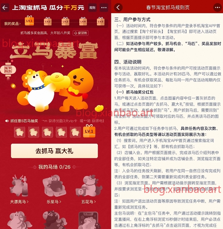 淘宝搜索“淘宝抓马”,集齐5/10/15/20/26匹马抽实物或荭包,前1w名集齐6匹马必得实物