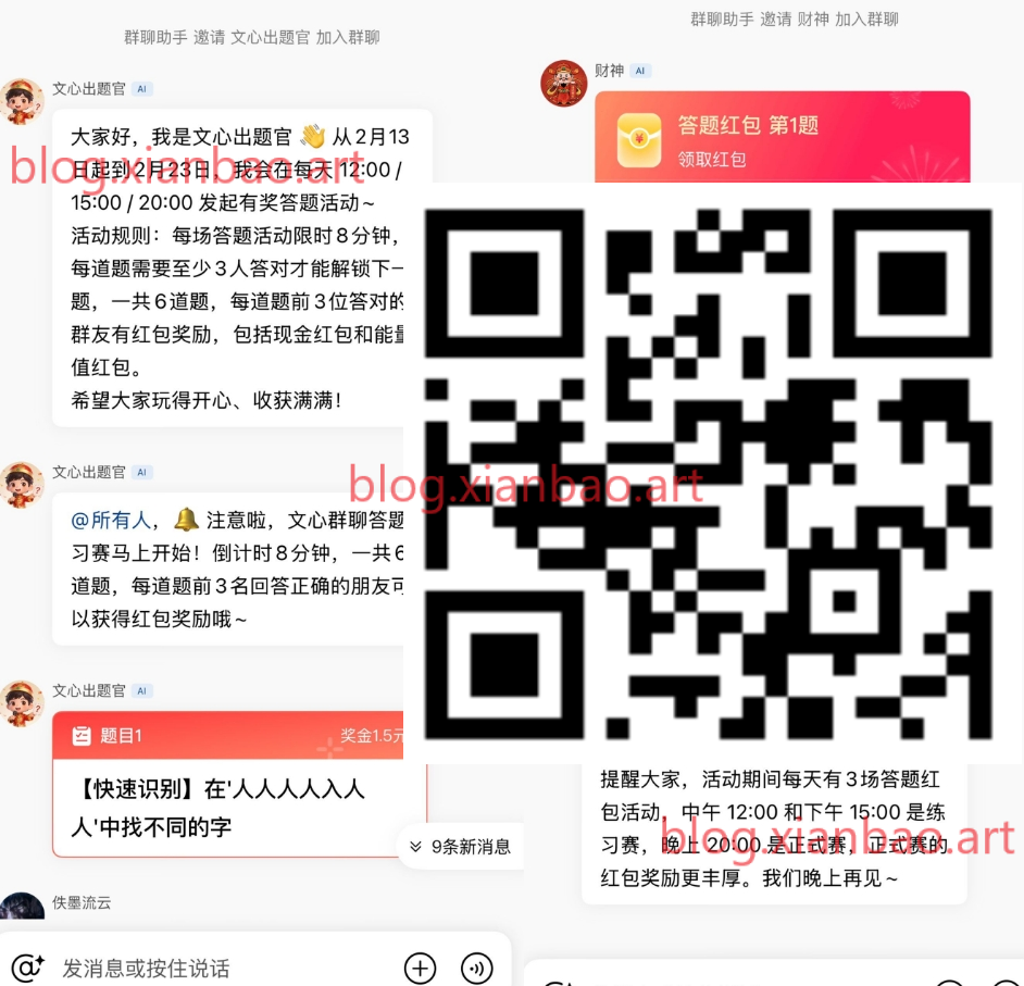 文心APP新春活动,参与每天3场答题共10天,每次是5-6道题 ,每道题随机瓜分0.8~5,答题需要右上方创群,需5人组队,3人在线才能开启,答题前3位才能领,每天12点/15点/20点答题参与,大年初一/三/五/八 19点开启群聊红包雨。