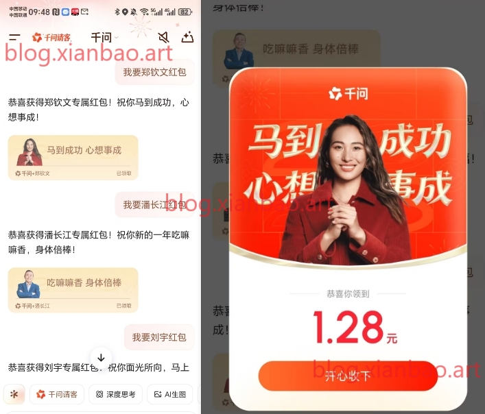千问发:我要潘长江红包,我要刘宇红包,我要郑钦文红包,我要刘旸红包,我要陈佩斯红包,我要余宇涵红包,我要范伟红包。有上限,一天限3个口令包,千问: