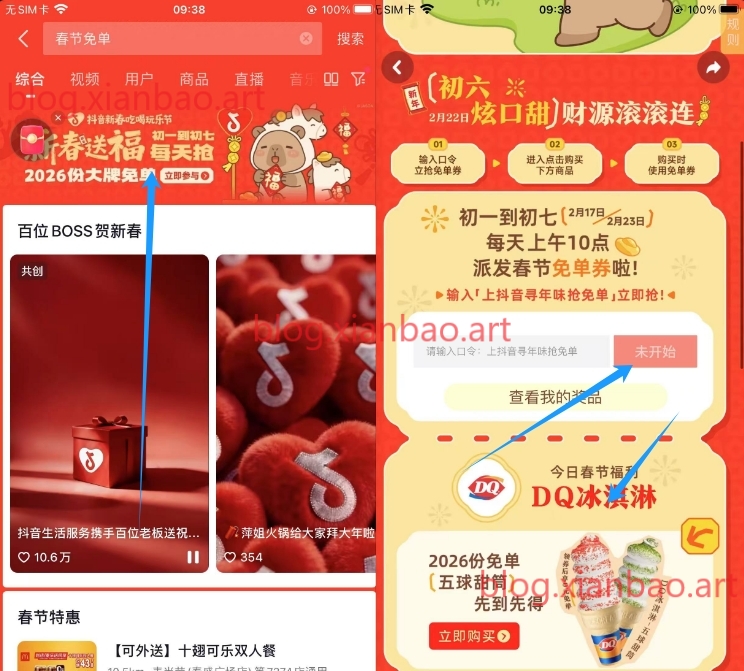 抖音搜:春节免单,口令:上抖音寻年味抢免单,10点抢2026份DQ免单券