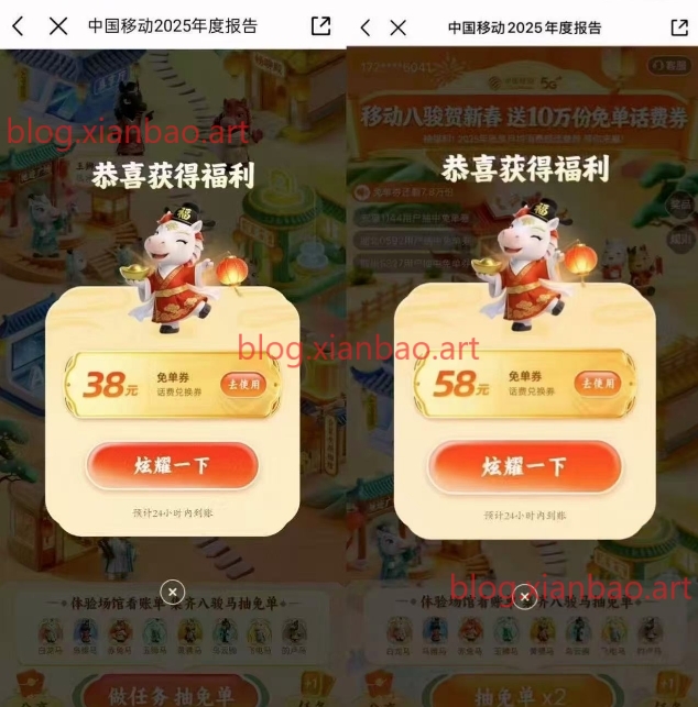中国移动app搜:2025年度报告,先挨个点一遍拿卡合成再抽,右下角随便浏览三个,至多一天四次机会,可以抽话费