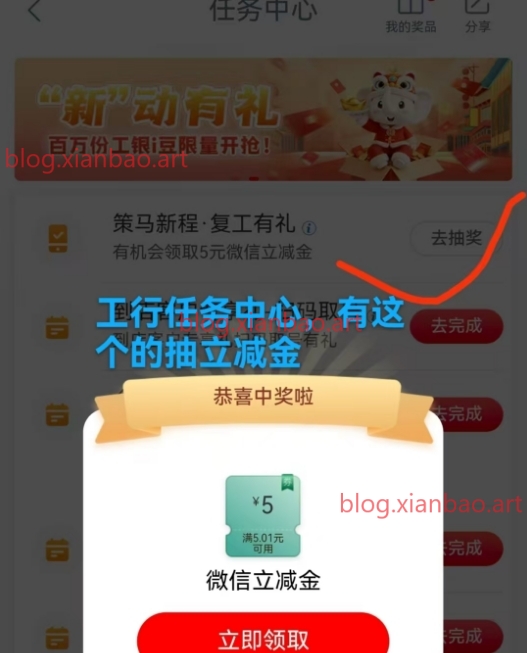 任务中心部分有复工有礼,抽5立减金