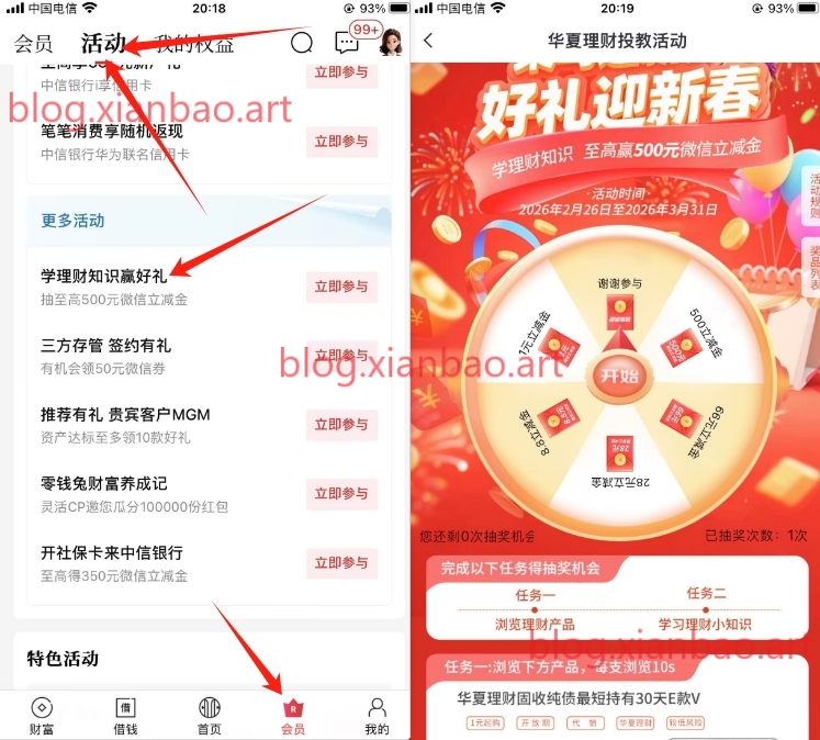 路径:中信银行APP-底部“会员”,顶部切换活动,下拉至更多活动,学理财知识赢好礼,完成浏览任务抽,非必中。需手动领