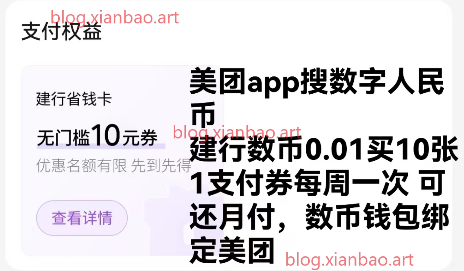 美团app搜数字人民币,建行数币0.01买10张1亓支付券每周一次,可还月付,建行数币钱包绑定美团