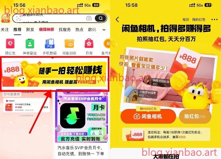 闲鱼app首页横幅,每天拍照得次数,抽0.88~888亓购物荭包,荭包可以搜“京东e卡”或者买自己想要的抵扣