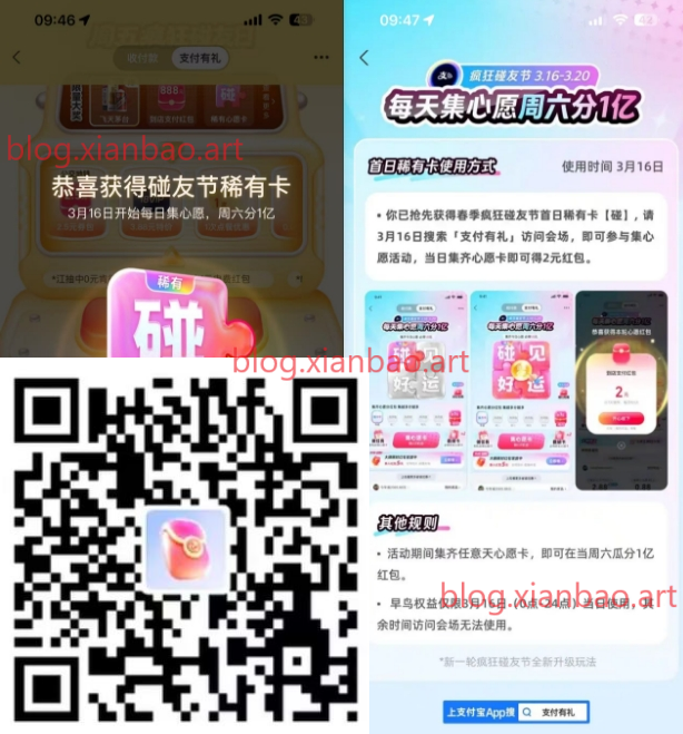 支付宝搜索支付有礼或首页横幅碰友日点进去,下拉抽五次,会有一张稀有卡,先拿卡16号集齐有2亓券(非常好集),弹窗也有连续三天的碰一下券,不弹换小号试