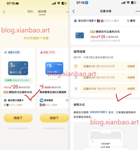 微xin公众号: 微xin支付,右下角“摇优惠”,今天部分可抽到建行1000-20