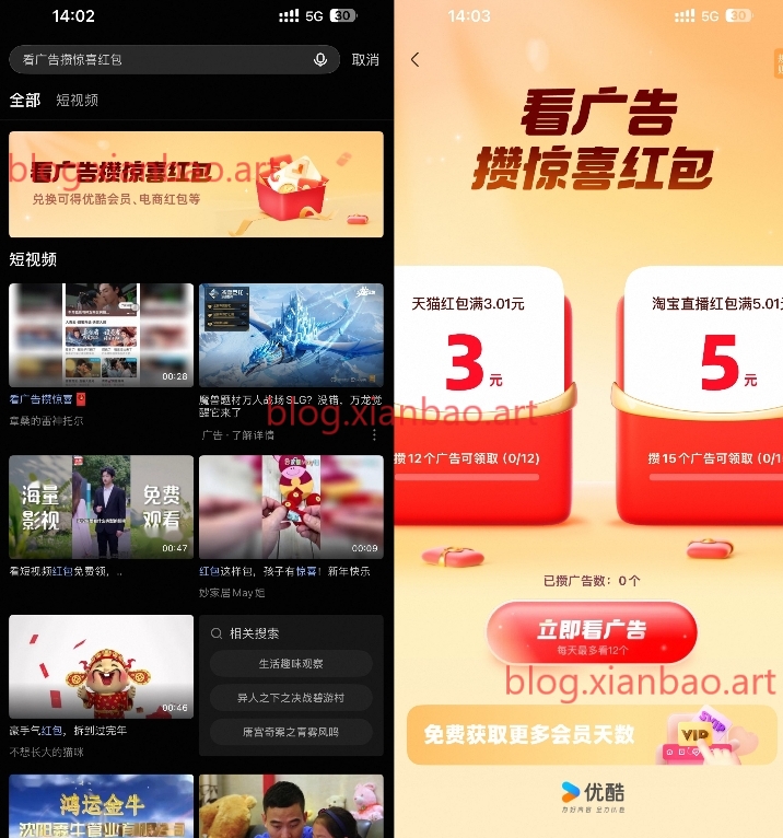 优酷APP搜索“看广告攒惊喜红包”,每天看广告领优酷会员或淘宝天猫荭包