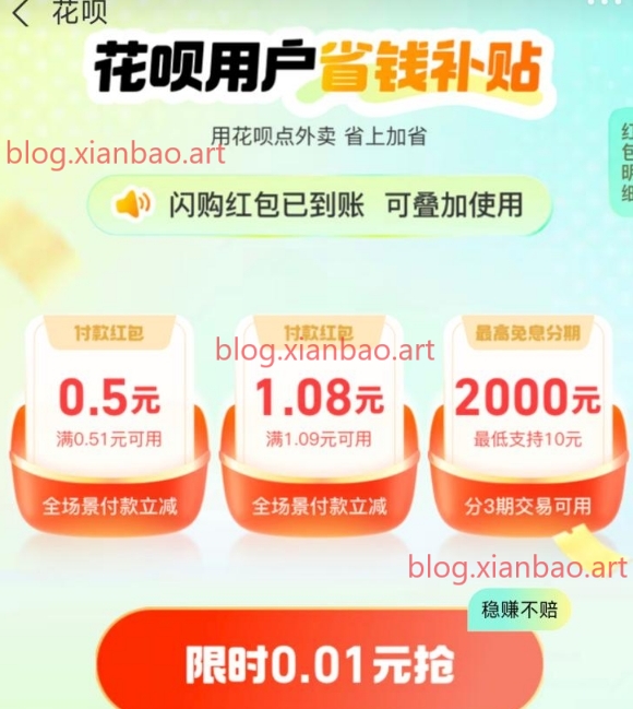 zfb搜花呗,部分号有0.01开省钱补贴,含0.51-0.5、1.09-1.08券