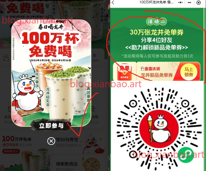 微xin识别,蜜雪冰城,弹窗或横幅下拉️,有邀4人得30w张免单券