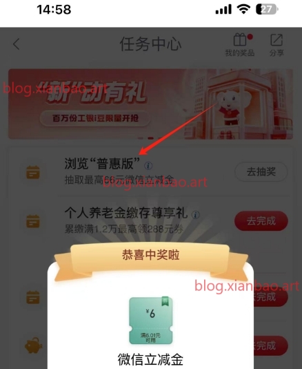 工行app-任务中心-浏览普惠版,切换一下回来就可以抽