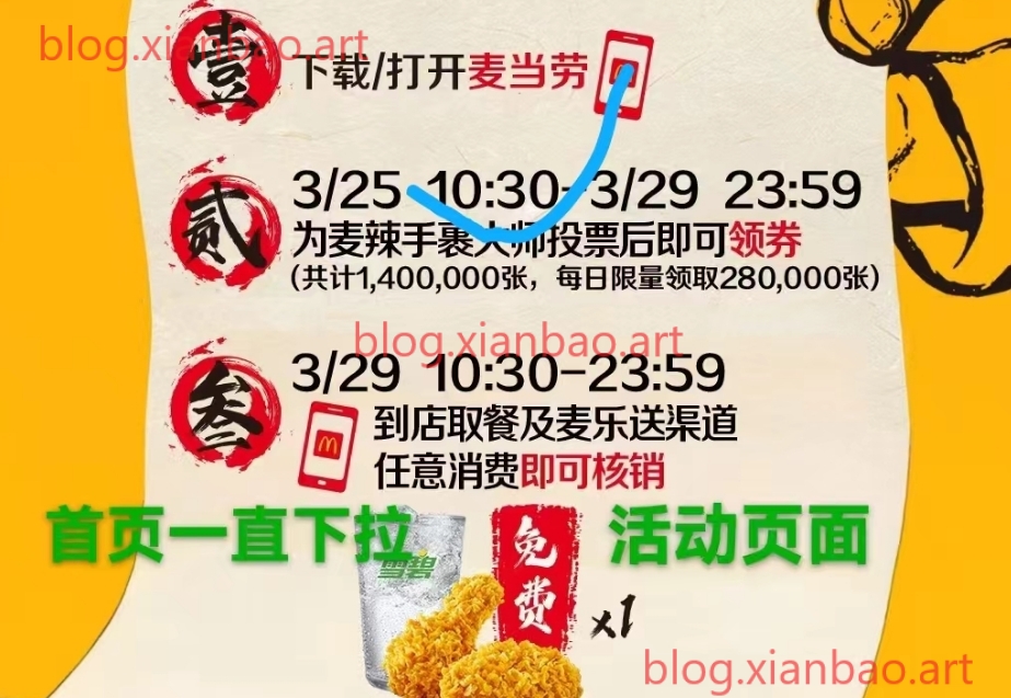 今日-3月29日每天10:30有38w份,麦当劳APP-首页下拉至-为手裹大师投票
