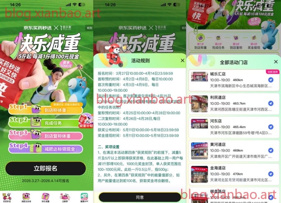 京东APP搜快乐减重,截4.14日先报名,减重5斤起,每减1斤得100零钱,最多1000,北上广天津等地区门店的感兴趣看看有点难度 ✅拉三个号+下载APP才能报名 ✅需首称+复称 两次预约 ✅发布指定内容且审核通过