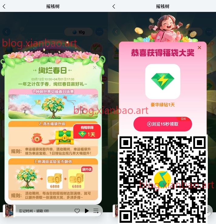 QQ音乐底部“我的”,右上角点三横扫码进入,浇水会弹宝箱,部分有看4个广告1天绿钻