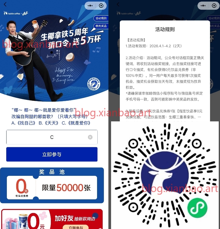 瑞幸抽5w张0亓饮品兑换券