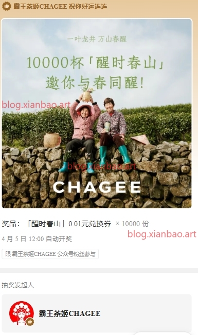 第一个活动:#公众号:霸王茶姬CHAGEE,回复:一叶龙井万山春醒,明天12点开,抽1w份醒时春山