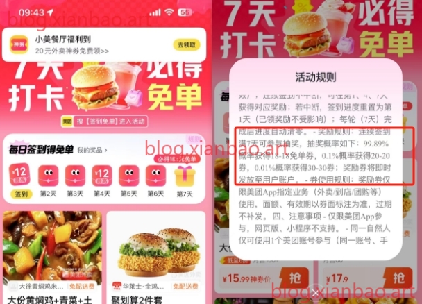 美团app搜:签到免单,签到7天最少18-18外卖券,极低概率20-20/30-30无门槛