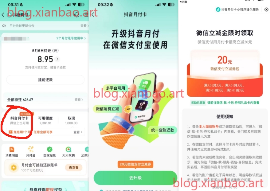 抖音-我的-我的钱包-抖音月付,如图月付卡右上角显示20微xin立减金(4张5,部分是1分买18券包),