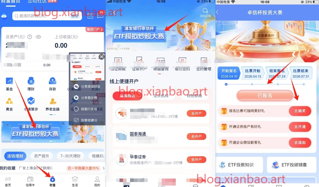 浦发银行app-底部财富-中间滚动横幅-浦发银行卓信杯-顶部横幅-模拟炒股大赛,报名可以抽一次,非必中