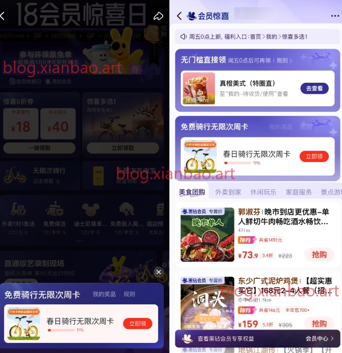 美团搜索“18会员日”-领单车无限次骑行周卡,有的地区没有就不显示