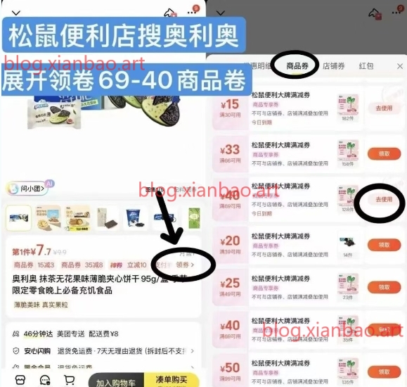 二:美团进“松鼠便利店”,搜奥利奥,在商品页面找到:69-40大牌零食券,部分地区的不在范围就不显示商品券,忽略