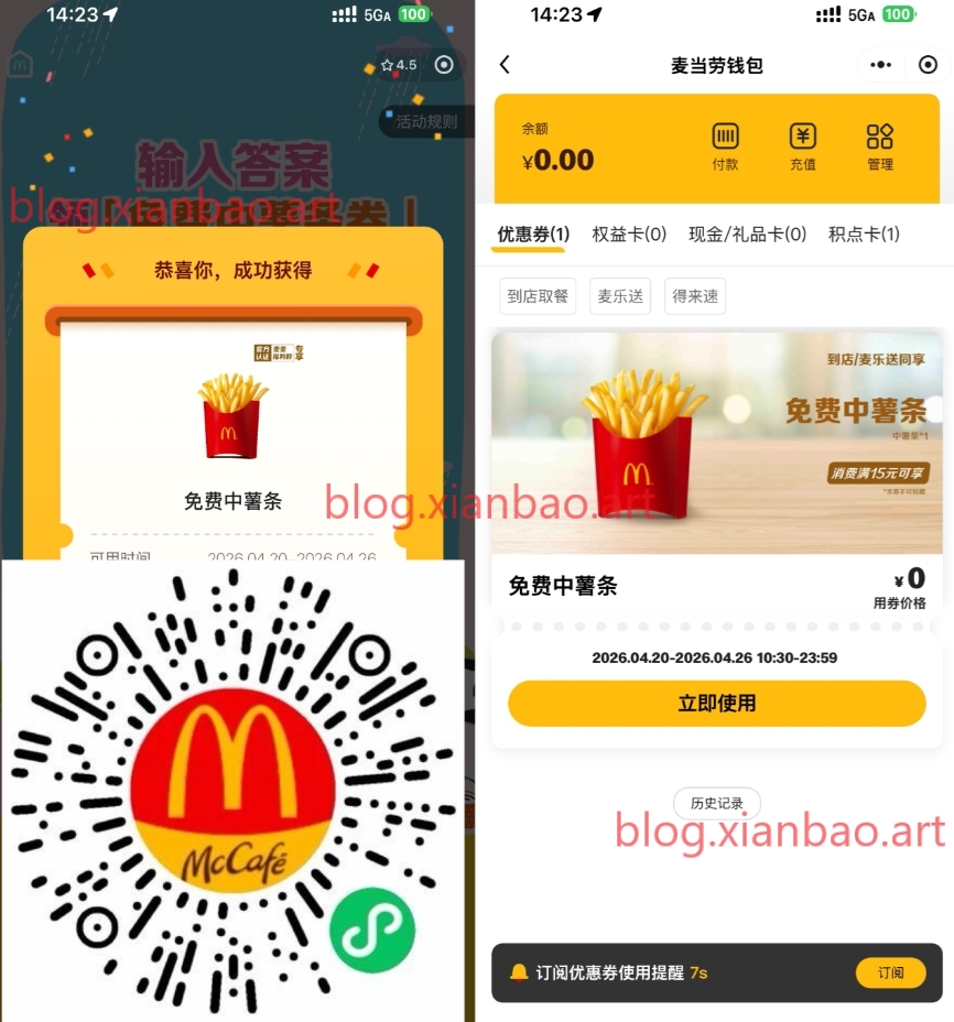 微xin识别,输入口令“A”免费薯条券,需任意消费15亓随单使用,mp://EhUlDn4sbaYlSob