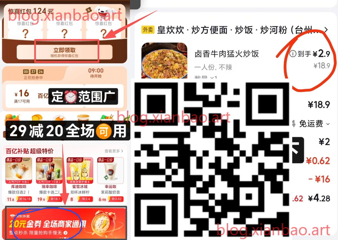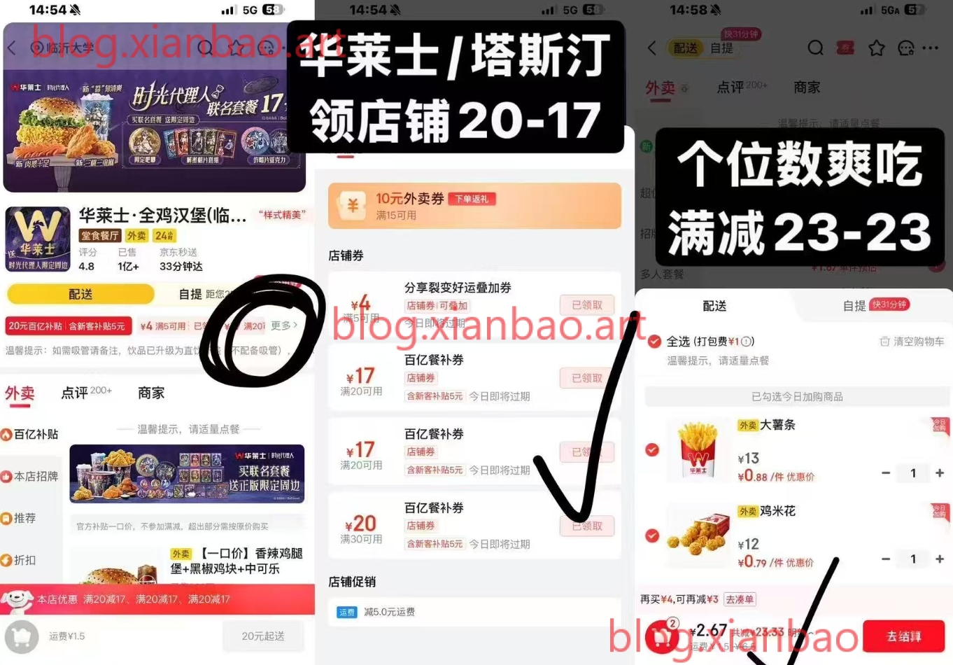 三:京东切外卖再搜:塔斯汀,店铺标题下把所有券给领取,店铺20-17叠5-4就是减21!,自己凑满21/22 就可以1~3吃