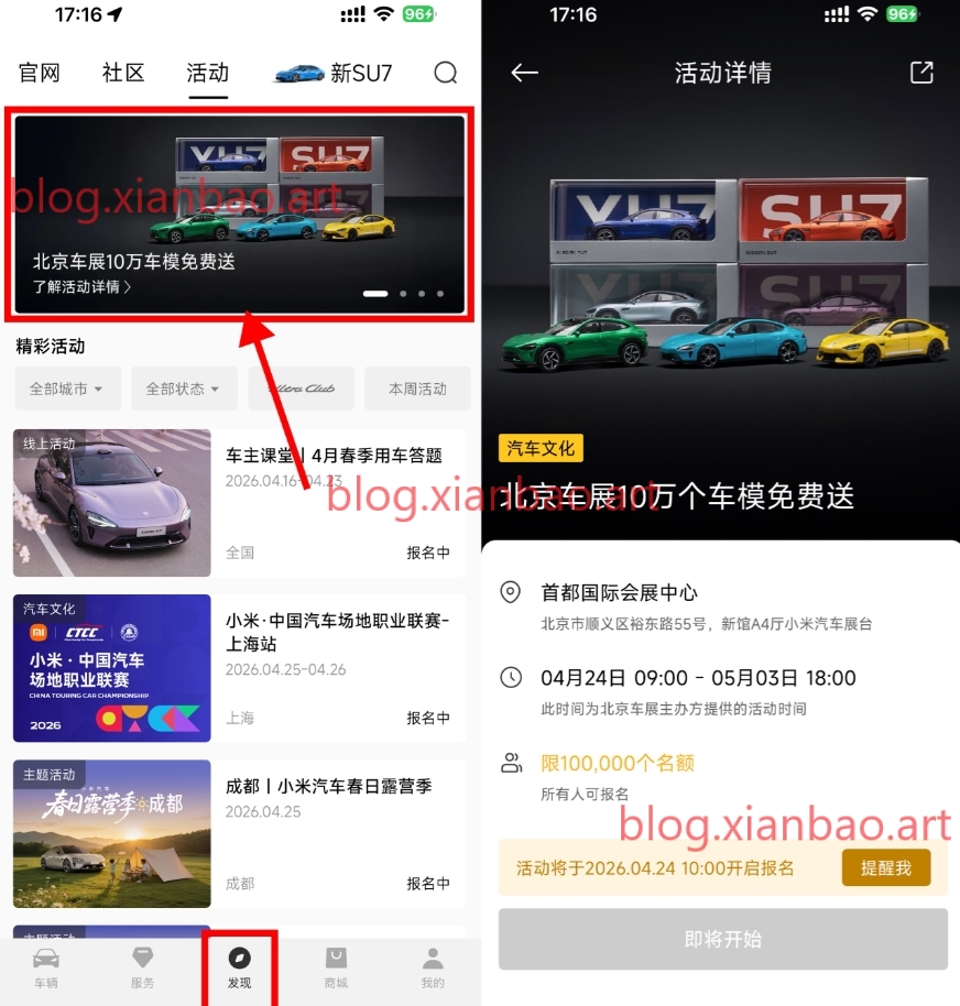 小米汽车APP底部“发现”,4月24日10点开始报名,到北京车展线下领小米汽车车模型一个,每天限量1w份