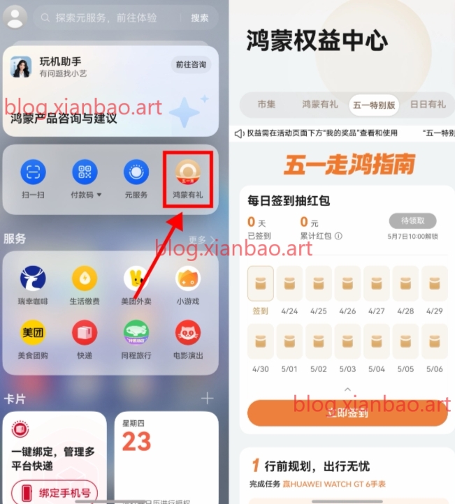 华为鸿蒙五一每天签到荭包