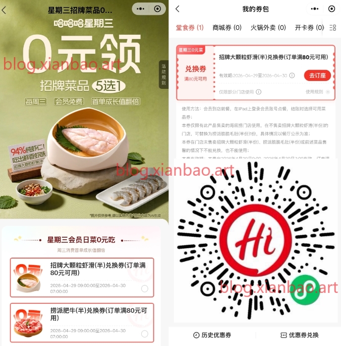 微xin识别,5选1领半份菜品券,限明天4月29日可用,刚好要吃海底捞的可以领下!mp://lPXR04ayCLUphoI